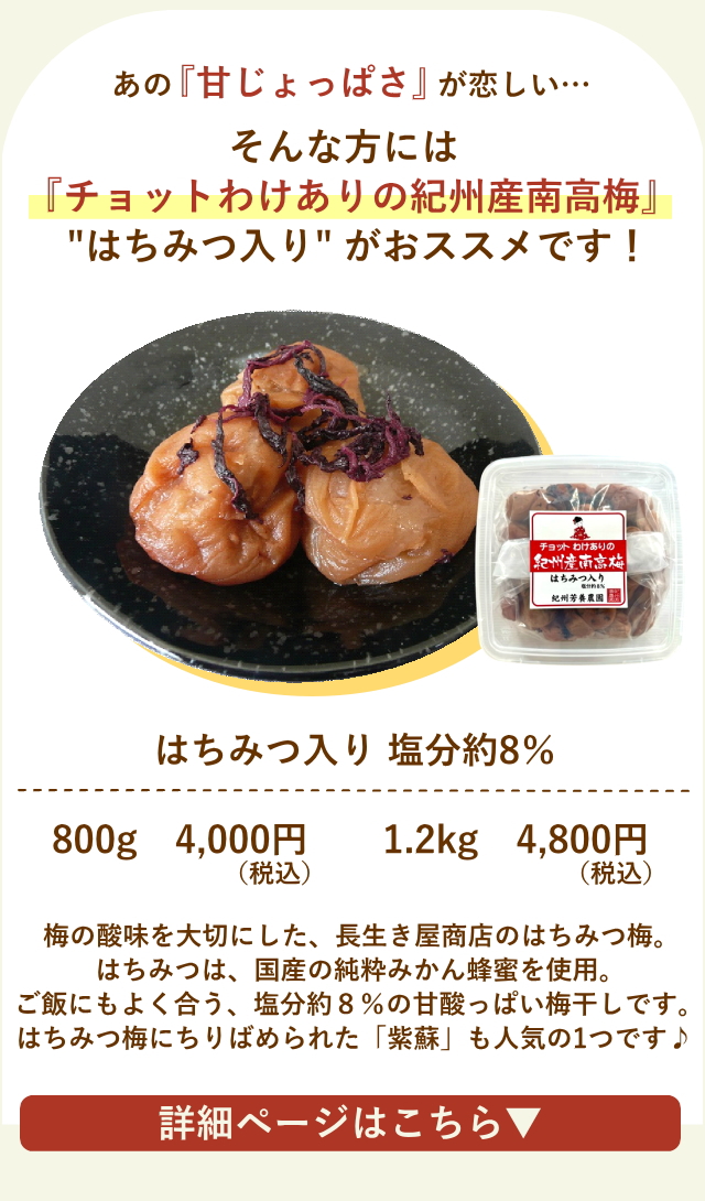 お味リニューアル 【紀州産南高梅】 紀州産 いちばんぼし 700g 4,000円税込 お味リニューアル 【紀州産南高梅】 紀州産 いちばんぼし 1.2kg 5,700円税込 「梅干しの効能」詳細はこちら トップページに戻る