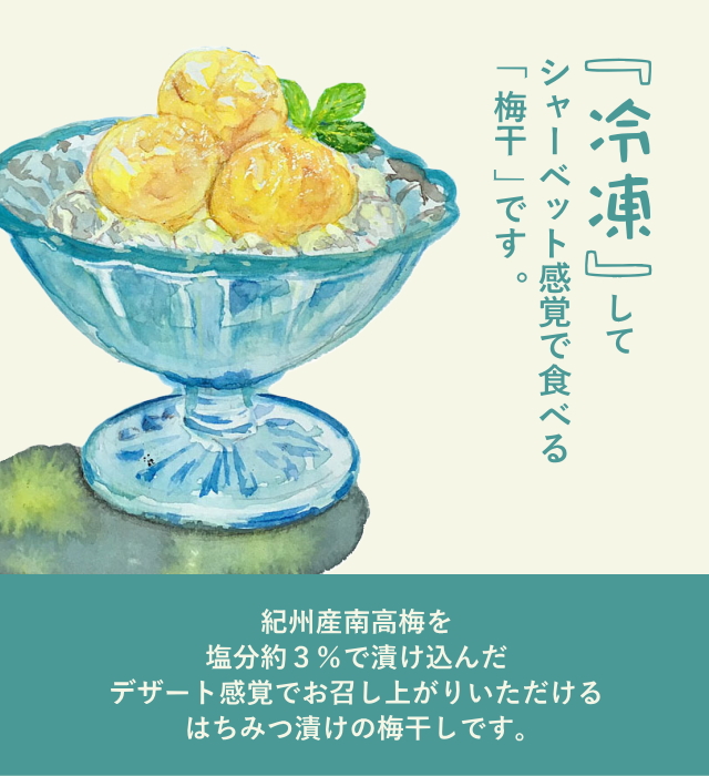 価格:1,080円(税込) レビューを書く 【紀州産南高梅】 梅シャーベット はちみつ入り 塩分約3% 65g 540円税込 【紀州産南高梅】 梅シャーベット はちみつ入り 塩分約3% 150g 1,080円税込 【紀州産南高梅】 梅シャーベット はちみつ入り 塩分約3% 430g 3,500円税込 「梅干しの効能」詳細はこちら 内容量 150g 賞味期限 180日 原材料 梅、漬け原材料[果糖ぶどう糖液糖、果実酢、食塩、はちみつ]、調味料(アミノ酸等)、甘味料(スクラロース)、ビタミンB1、ユッカ抽出物 トップページに戻る